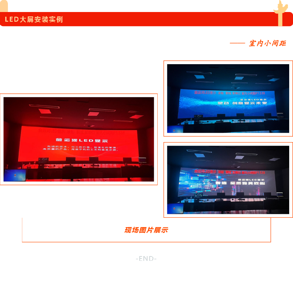 1.對比度非常高,白平衡一致,顯示色彩均勻,畫面清晰度高,能滿足現(xiàn)場直播的要求;2.超高刷新頻率,完全杜絕掃描線出現(xiàn),滿足舞臺拍攝的需要,呈現(xiàn)完美效果。
